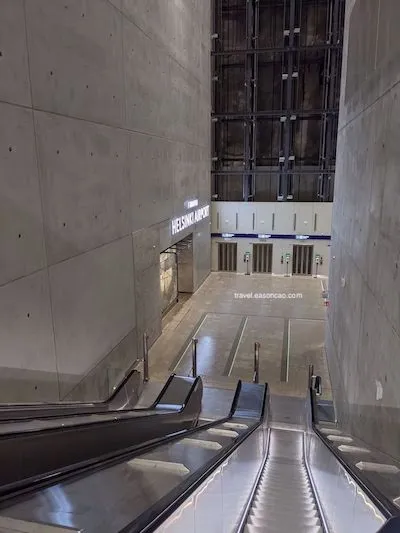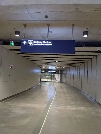 最後,我終於成功按下 No Customer Card 才真正導向到結帳流程,結束這場鬧劇。並且在機場時尚的建築稜角和指標尋找到通往地面列車的方向: