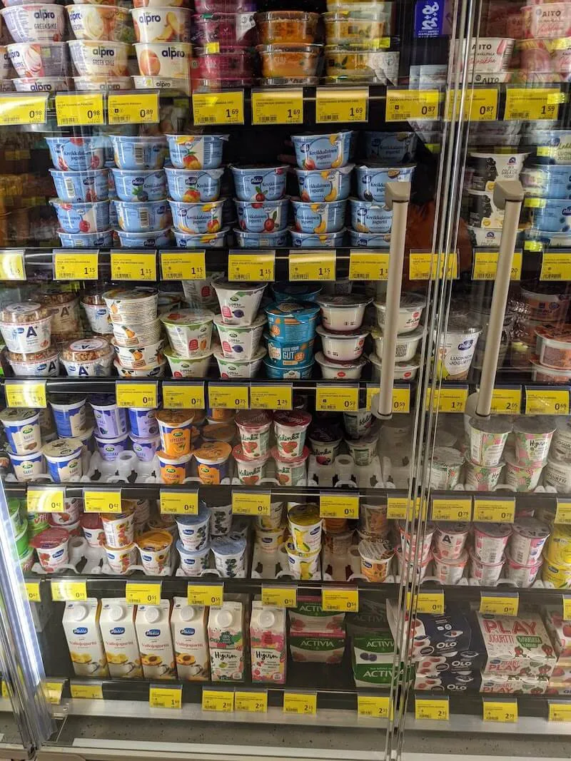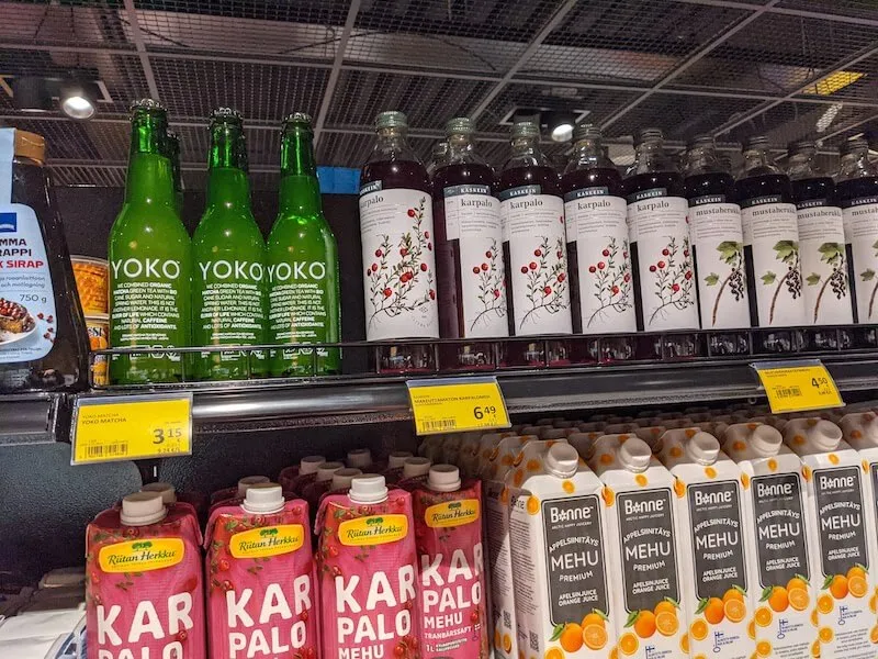 Helsinkin 機場裡面也有 24 小時的超商,可以看到一整排的優格和 Karpalo (蔓越莓果汁)