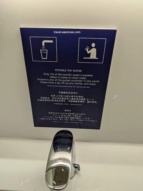 而且自從在飯店喝了幾口 Tap Water,認真覺得芬蘭的 Tap Water 很好喝,幾乎跟罐裝寶特瓶水無異了,在機場洗手間還可以看到這樣的告示: